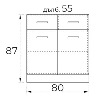 ● Долен кухненски шкаф с две врати плавно затваряне, рафт и две чекмеджета.