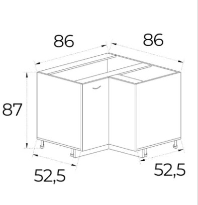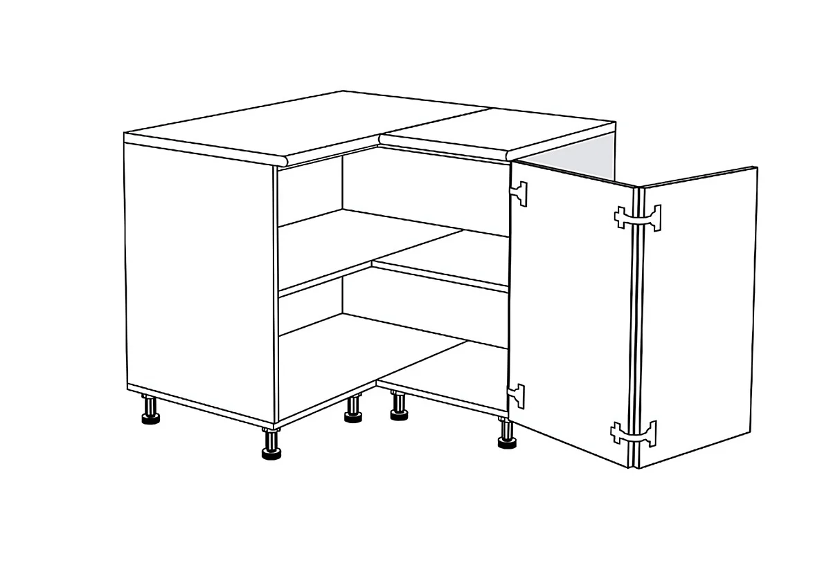 ● Долен ъглов кухненски шкаф с две свързани вратички, които осигуряват удобен достъп до цялата вътрешност. Едната е закачена за другата с панти като отварянето на едната врата води до отварянето на втората.