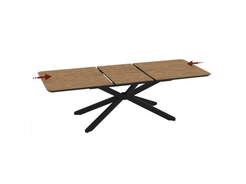 ✔ Плотът е в топлия тон на меден дъб, изработен от фурнирован MDF, който носи естетиката на естественото дърво и топлината на природата. Основата е от черен метал, с разклонена кръстосана конструкция, вдъхновена от архитектурата и стабилността – стабилна трапезна маса, която издържа на време и стил.