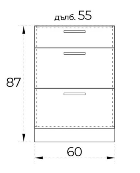 ● Долен кухненски шкаф с три чекмеджета плавно затваряне. Чекмеджетата са със система за пълно изтегляне и плавно прибиране InnoTech Atira – Hettich.