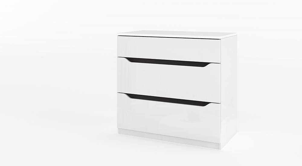 Скринът с три чекмеджета допълва комплекта и предлага допълнително пространство за съхранение. Неговият изчистен дизайн и гланцовите повърхности го правят както практичен, така и стилен елемент в спалнята.