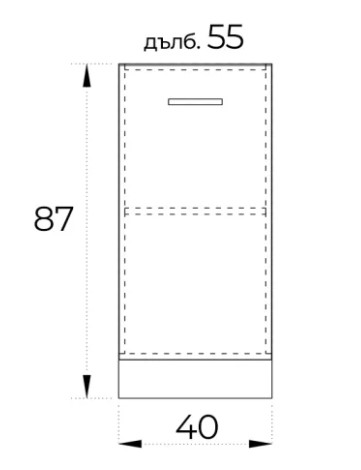 ● Долен кухненски шкаф с една врата плавно затваряне и рафт. Вратата се отваря наляво.