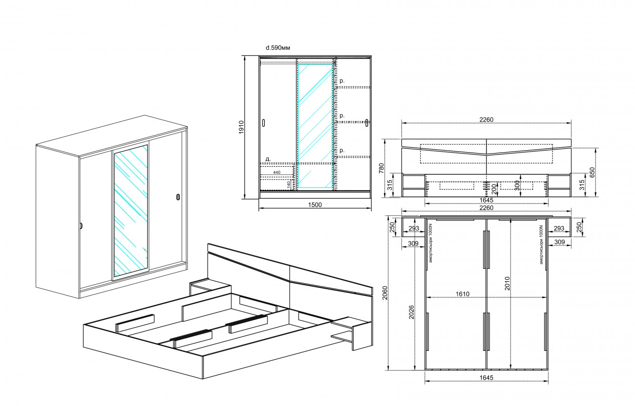● Гардероб Сити 1006: Ширина 1500 мм./Дълбочина 590 мм./Височина 1910 мм.