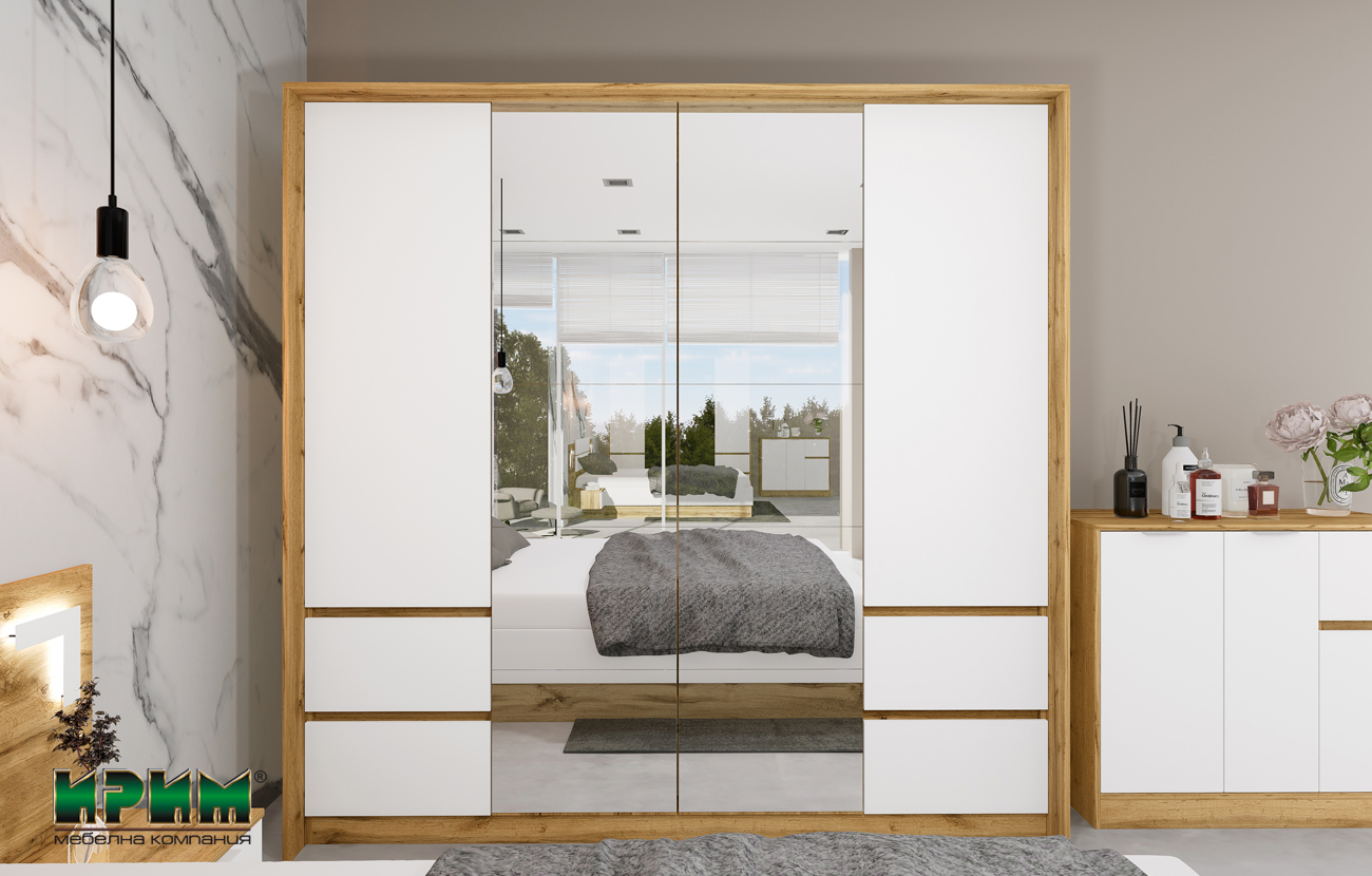 Гардеробът с огледални плъзгащи врати комбинира естетика и организация, а скринът с плавно затваряне е истински помощник за подредения живот. Всички механизми са висококачествени и безшумни – за уют без излишен шум.